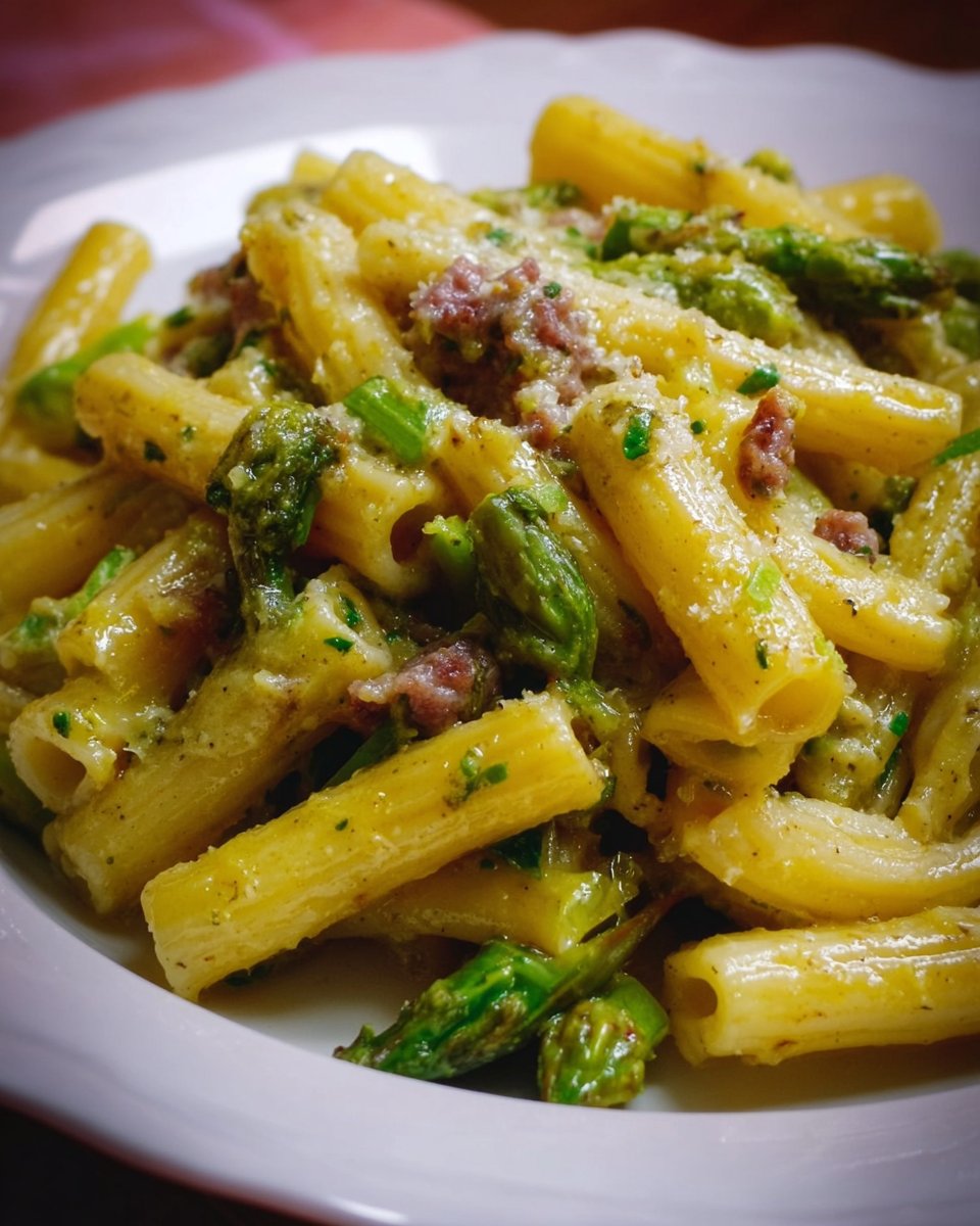 Tortiglioni alla carbonara con asparagi selvatici e salsiccia